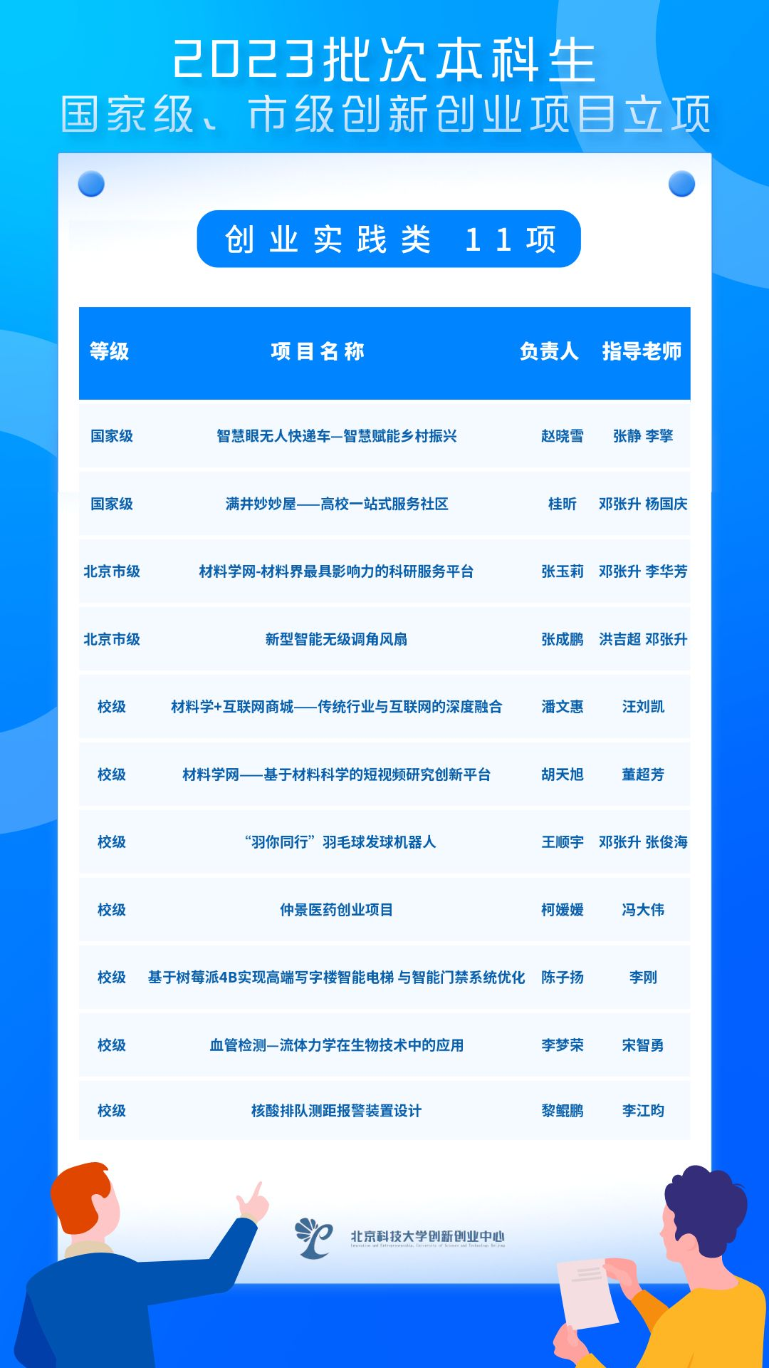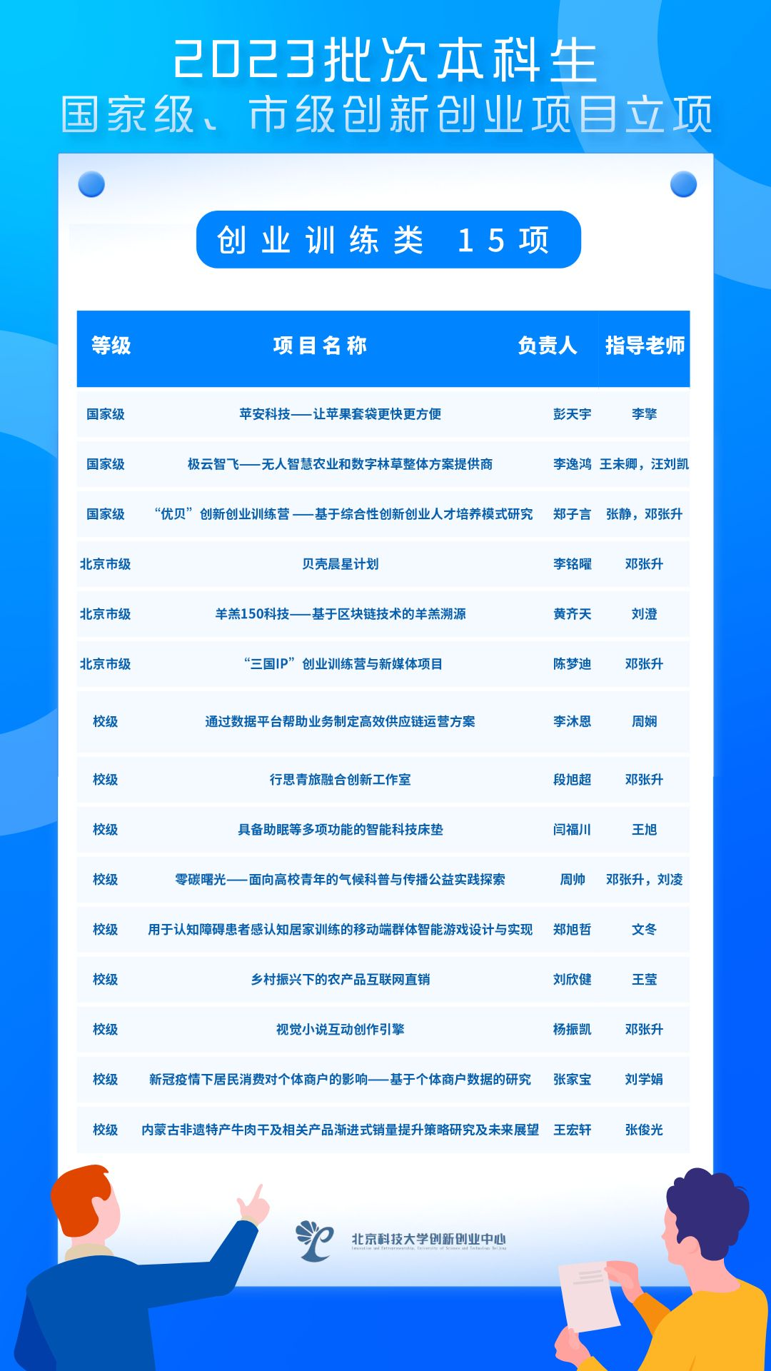 经评审,2023批次全校本科生创新创业计划项目共立项862项,其中国家级项目50项,北京市级项目149项,校级项目663项。2023批次全校国家级、市级和校级项目立项结果见附件1和附件2。
