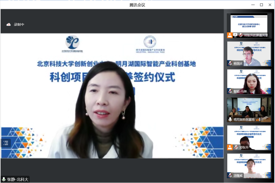 接下来张静致辞。张静首先表示了对重庆明月湖智能科技发展有限公司能够积极支持博88 科创项目的感谢。接下来她从三方面介绍北科大的创新创业相关工作。