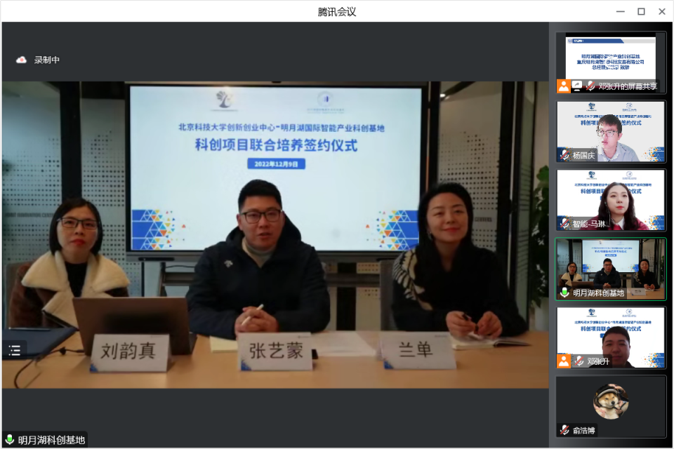 12月9日上午10点,博88 创新创业中心-重庆明月湖智能科技发展有限公司科创项目联合培养协议签约仪式在线上举行。重庆明月湖智能科技发展有限公司总经理张艺蒙、市场运营总监兰单、市场运营主任刘韵真,博88 创新创业中心副主任张静、教师杨国庆,博88 部分博88 创新创业分中心教师李奕明、丁宁、汤隆威、俞浩博、马琳参加仪式。仪式由创新创业中心教师邓张升主持。