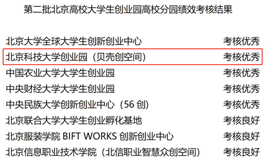 按照《北京市教育委员会关于开展第二批北京高校大学生创业园高校分园绩效考核工作的通知》(京教函〔2022〕405号)要求,经高校总结、现场答辩及专家评审等环节,8个高校分园拟通过考核,其中5个高校分园考核优秀,3个高校分园考核良好。现将绩效考核结果公示如下: